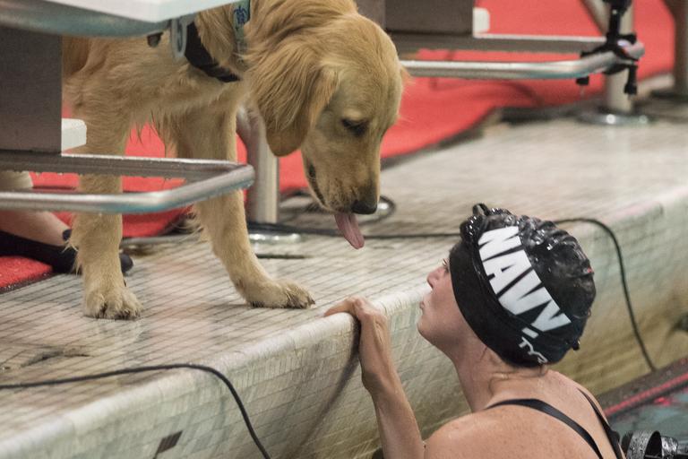 | Keywords: 2016 DoD Warrior Games 160620-D-BB251-007.jpg en Navy Petty Officer 3rd Class Abbie Johnson gets a kiss from her service dog Kona after competing in swimming during the 2016 Department of Defense Warrior Games at the U S Military Academy in West Point New York June 20 2016 DoD photo by Roger Wollenberg <br>Unit Warrior Transition Command 2016-06-20 Roger Wollenberg https //www dvidshub net/image/2675688/2016-dod-warrior-games 160620-D-BB251-007 2016-06-20 17 32 WEST POINT NY US PD-USGov Warrior Games Images from DoD uploaded by Fæ |