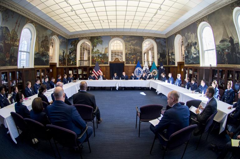 | Keywords: corps of cadets corpsofcadets u.s. coast guard academy uscoastguardacademy new london newlondon connecticut cadets officers academy brahm petty officer 2nd class richard brahm pettyofficer2ndclassrichardbrahm rear adm. james rendon rearadmjamesrendon u.s.a. usa hall room auditorium indoor dining dining room NEW LONDON, Conn - Retired Air Force Lt. Gen. James Clapper, current director of National Intelligence, spoke to the Corp of Cadets, March 23, 2016, as the 2016 Hedricks Fellow Clapper served as director of the Defense Intelligence Agency from 1992 until 1995, was the first Director of Defense Intelligence within the Office of the Director of National Intelligence and simultaneously the Under Secretary of Defense for Intelligence, was the director of the National Geospatial-Intelligence Agency from September 2001 until June 2006, and on June 5, 2010, President Barack Obama nominated Clapper to replace Dennis C. Blair as U.S. Director of National Intelligence. Clapper was unanimously confirmed by the Senate for the position on August 5, 2010. Official U.S. Coast Guard photos by Petty Officer 2nd Class Richard Brahm. NEW LONDON, Conn - Retired Air Force Lt. Gen. James Clapper, current director of National Intelligence, spoke to the Corp of Cadets, March 23, 2016, as the 2016 Hedricks Fellow Clapper served as director of the Defense Intelligence Agency from 1992 until 1995, was the first Director of Defense Intelligence within the Office of the Director of National Intelligence and simultaneously the Under Secretary of Defense for Intelligence, was the director of the National Geospatial-Intelligence Agency from September 2001 until June 2006, and on June 5, 2010, President Barack Obama nominated Clapper to replace Dennis C. Blair as U.S. Director of National Intelligence. Clapper was unanimously confirmed by the Senate for the position on August 5, 2010. Official U.S. Coast Guard photos by Petty Officer 2nd Class Richard Brahm. |