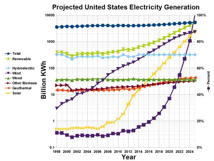 | Keywords: 2025 Projected United States Electricity Generation.png en Projected electricity generation in the United States based on 1 annual growth in demand 10 growth in geothermal 30 annual growth in wind power and 60 annual growth in solar power Total renewable generation is projected to reach 100 by 2025 The rate of increase of solar has been increasing by 10 each year and if that trend continues the amount of solar generation will exceed wind by 2019 and 100 of electricity will be from renewable sources by 2020 with 28 from wind power and 69 from solar power 2012-07-26 own Delphi234 Compare with File AEO 2015 Growth Projection for US Wind and Solar png the official US DOE projection which does not foresee any significant contribution from wind power or solar power through 2040 cc-zero Uploaded with UploadWizard Electricity production trends Electricity in the United States |
