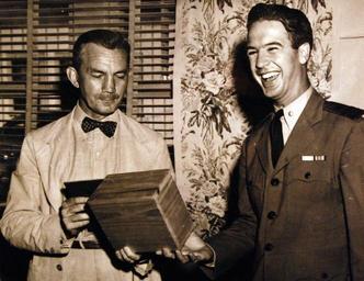 | Keywords: people groupshot monochrome 208-PU-70A-3: Secretary James V. Forrestal Makes Last Inspection of Bomb Disposal School. As a memento of his inspection of the Washington, D.C., Navy Bomb Disposal School at American University, Secretary of the Navy James Forrestal is presented with a humidor and cigarette lighter made from captured enemy equipment by the Officer-in-Charge of the school, Lieutenant Commander J.P. David, USNR. The humidor was made from a Nazi fuse and the lighter which is inside the humidor – from a Japanese hand grenade. The school, scheduled to be decommissioned on September 30, 1945, holds the last graduation on September 15. Photograph released September 12, 1945. Office of War Information Photograph, now in the collections of the National Archives. (2016/03/29). 208-PU-70A-3: Secretary James V. Forrestal Makes Last Inspection of Bomb Disposal School. As a memento of his inspection of the Washington, D.C., Navy Bomb Disposal School at American University, Secretary of the Navy James Forrestal is presented with a humidor and cigarette lighter made from captured enemy equipment by the Officer-in-Charge of the school, Lieutenant Commander J.P. David, USNR. The humidor was made from a Nazi fuse and the lighter which is inside the humidor – from a Japanese hand grenade. The school, scheduled to be decommissioned on September 30, 1945, holds the last graduation on September 15. Photograph released September 12, 1945. Office of War Information Photograph, now in the collections of the National Archives. (2016/03/29). |