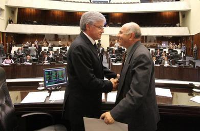 | Keywords: Presidente da Assembleia Legislativa, deputado Valdir Rossoni (PSDB), cumprimenta o procurador de Justiça, Gilberto Giacoia, recentemente indiado pelo governador Beto Richa para ser o novo procurador-geral de Justiça, chefiando o Ministério Público do Paraná. Foto: Nani Gois/Alep (crédito obrigatório) poderlegislativo valdirrossoni gilbertogiacoia |