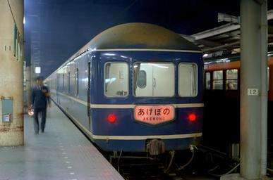 | Keywords: 20 akebono 1976.JPG A Japanese National Railways 20 series generator van at the rear of an Akebono limited express sleeping car service at Ueno Station in Tokyo ja 20系あけぼの 上野駅にて 1976 own Shellparakeet cc-zero Uploaded with UploadWizard JNR 20 series passenger cars Akebono train Trains at Ueno Station 1976 in rail transport in Japan |