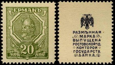 | Keywords: 20 Kopeek cosacos, 1918.jpg en Russia government of the Don Territory money stamp 20 kopeks 1918 Разменная ма ка Донской области достоинством 20 копеек об азца 1918 года Всевеликое Войско Донское Лицевая сто она Изоб ажён Е мак Тимофеевич Catalogue number Mi 6 Scan of original 1918 Bank of Rostov/Ростовская конто а Госбанка 1918 currency Banknotes of Don 1918 Banknotes with a face value of 20 Yermak Stamp money Stamps of the Don Territory Stamps to be categorised by subject | ||||