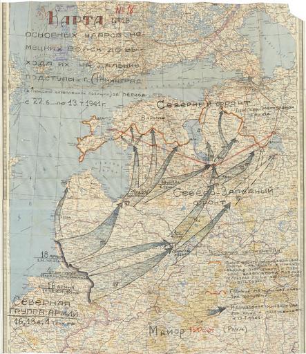 | Keywords: Карта ЛФ с 22.06.41 по 13.07.41.jpg ru Ка та основных уда ов немецких войск до выхода их на дальние подступы к г Ленинг ад к Лужской ук епленной позиции за пе иод с 22 06 1941 г по 13 07 1941 г 1941-07-13 ЦА О фонд 217 опись 1221 единица х анения 227 http //podvignaroda mil ru/ Полевое уп авление Ленинг адского ф онта опе ативный отдел штаба PD-Old-70 Check categories 2015 June 17 Luzhkiy Rubezh | ||||