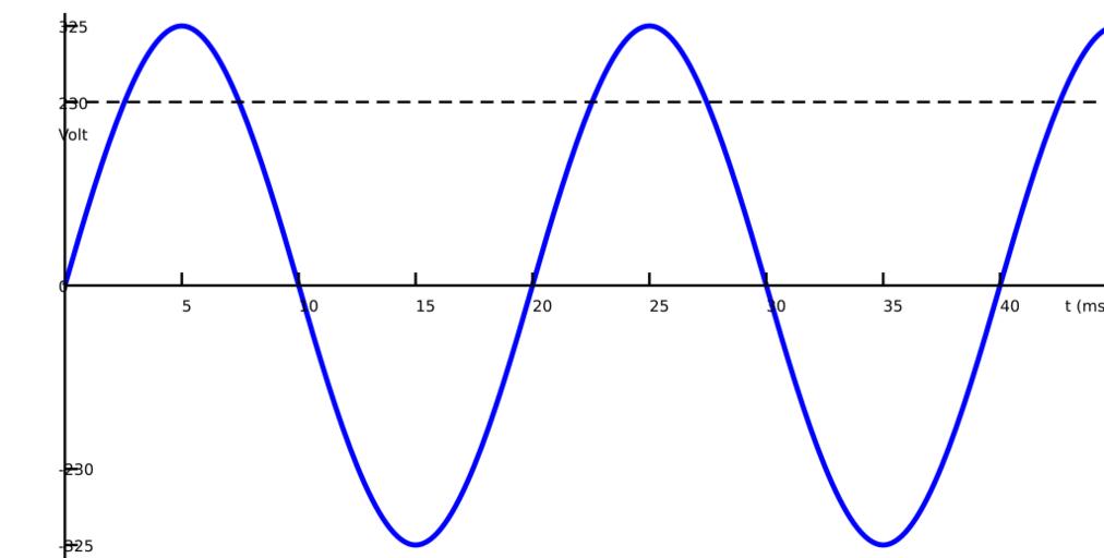 Keywords: 230volt 50Hz.svg A graph of the 230 volt 50 Hz electrical mains voltage as a function of time; the root-mean-square voltage is 230 V but the peak value is sqrt 2 times larger Own 2007-06-07 Pieter Kuiper ValidSVG Mains electricity