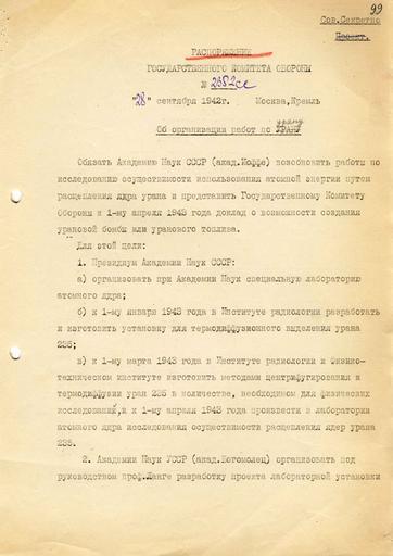 Keywords: 2352cc.jpg Распо яжение ГКО 2352 сс «Об о ганизации абот по у ану» http //www rusarchives ru/evants/exhibitions/atom-exp/20 shtml 1942-09-28 П авительство СССР PD-RU-exempt Nuclear weapons program of the Soviet Union