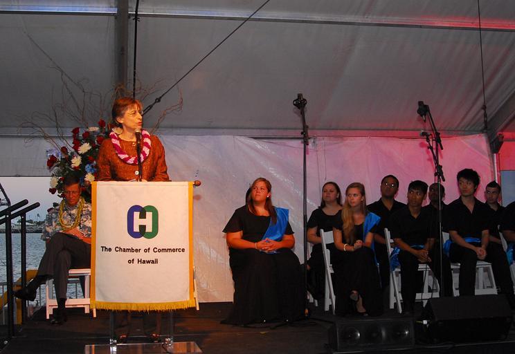| Keywords: 24th annual Hawaii Military Appreciation Month 090430-N-PB212-036.jpg en Hawaii Gov Linda Lingle speaks to guest during the 24th annual Hawaii Military Appreciation Month kick off ceremony aboard the Battleship Missouri Memorial 2009-04-30 U S Navy photo by Mass Communication Specialist 2nd Class John Wallace Ciccarelli Jr / Released https //www dvidshub net/image/1574580 090430-N-PB212-036 2014-09-29 14 52 PEARL HARBOR HI US PD-USGov-Military-Navy Linda Lingle Battleship Missouri Memorial Images from DoD uploaded by Fæ |