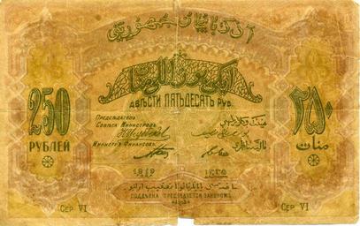 | View Original: | 250-rouble_note_of_Russia,_Azerbaijan_1919_-_back.jpg (5660x3562) | |||