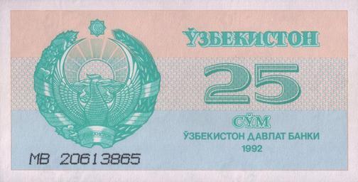 | Keywords: 25 som. Uzbekistan, 1992 a.jpg 25 сум Узбекистана 1992 25 sum of Uzbekistan 1992 own scan 1992 Central Bank of the Republic of Uzbekistan Цент альный банк Республики Узбекистан Ўзбекистон Республикаси а казий банки PD-UZ-exempt banknotes Banknotes of Uzbekistan 1992 Banknotes with a face value of 25 Coats of arms of Uzbekistan on banknotes |