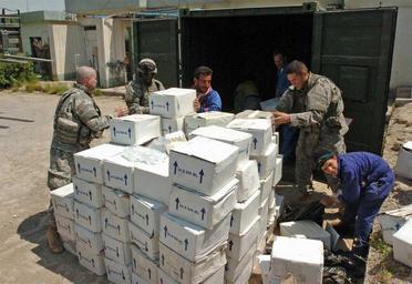 | Keywords: 25th ID Troops Deliver Supplies to Pediatric Hospital DVIDS42272.jpg en 25th Infantry Division Soldiers from Schofield Barracks Hawaii work with local Iraqis to unload a large delivery of vital medical supplies for the Kirkuk Pediatric Hospital in Kirkuk Iraq on April 19 The delivery consisted of IV fluids sutures antibiotics x-ray films and more The Kirkuk Pediatric Hospital is the only pediatric hospital in the province and has been undersupplied for over a year due to security issues with transporting medical supplies from the Ministry of Health in Baghdad 2007-04-19 Sgt Amanda White https //www dvidshub net/image/42272 42272 2007-04-24 09 25 KIRKUK IQ PD-USGov Schofield Barracks 25th Infantry Division United States Images from DoD uploaded by Fæ |