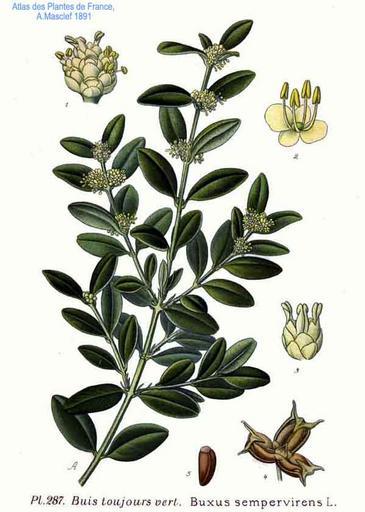 Keywords: 287 Buxus sempervirens L.jpg Buxus sempervirens L Atlas des plantes de France 1891 2001-01-31 Creator Amédée Masclef Reproduction of a painting that is in the public domain because of its age PD-old-70-1923 Atlas des plantes de France