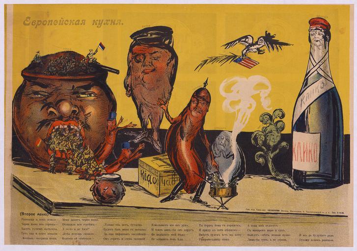 Keywords: 28-2 Sammlung Eybl Европейская кухня (Europäische Küche). 1914. 36 x 51 cm. (Slg.Nr.273).jpg Russland Alexander Apsit 1880-1943 Ев опейская кухня Europäische Küche 1914 36 x 51 cm Slg Nr 272 273 Fortsetzung des ersten Bildes Der russische Brei quillt aus dem Topf und klebt die österreichischen Würstchen am Boden fest Sie rufen die deutsche Wurst zu Hilfe doch die ist gerade damit beschäftigt die italienischen Makkaroni einzukochen und steht selbst unter Beobachtung des Champagners und des Roast Beefs Neu im Bild Der amerikanische Vogel mit dem Palmzweig des Friedensstifters Russia Alexander Apsit 1880-1943 Ев опейская кухня European kitchen 1914 36 x 51 cm Slg Nr 272 273 The Russian pulp swells out of the pot and sticks firmly the Austrian sausages on the ground Call the German sausage to help but they are just busy to cook the Italian Macaroni and is even under observation of champagne and Roast Beefs New Image The American Bird with the palm of peacemaker Sammlung Eybl Plakatmuseum Wien 2015-09-17 10 29 12 A Erhardt Credit line Eybl Plakatmuseum Wien/Wikimedia Commons CC-BY-SA-4 0 wiki Sammlung Eybl Plakatmuseum Wien PD-old World War I posters of Russia Plakatmuseum Wien Eybl Collection Quality images by Hubertl QualityImage |