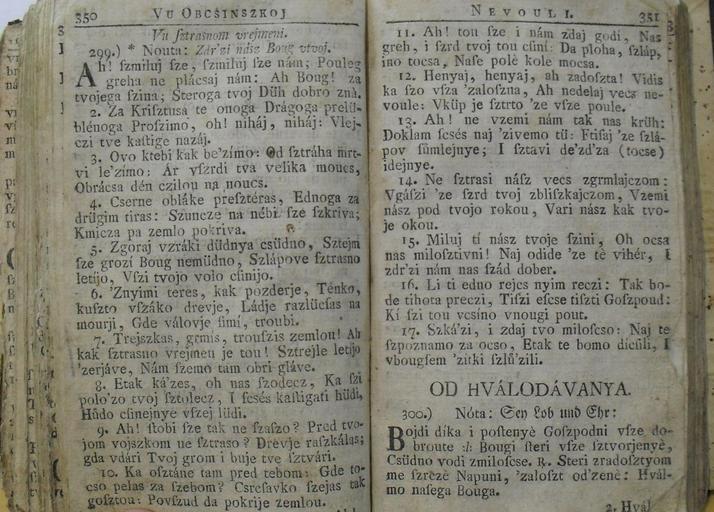 | Keywords: 299. i 300 pesem.JPG en The 299 and 300 hymn from the Mihály Bakos's Nouvi Gráduvál New Gradual in prekmurian prekmurščina First hymn is translated from Kajkavian Croatian second is from German language Pokrajinska in študijska knjižnica Murska Sobota User Doncsecz 2012-03-16 PD-old Hymnals Mihály Bakos Nouvi Gráduvál Lutheranism Prekmurje Slovene hymnals Prekmurje Slovene prayer books | ||||