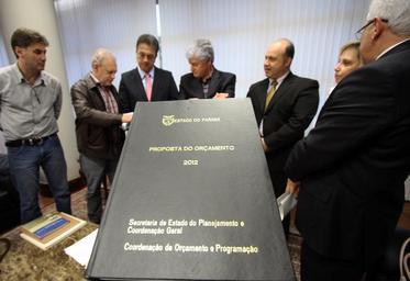 | Keywords: paranhos ademar traiano ademartraiano plauto miró plautomiró valdir rossoni valdirrossoni orçamento ppa A proposta do Orçamento do Estado para o exercício de 2012 e o Plano Plurianual (PPA) para 2012/2015 foram entregues pelo chefe da Casa Civil, Durval Amaral, nesta quinta-feira (29), ao presidente da Assembleia Legislativa, deputado Valdir Rossoni. A entrega aconteceu no Gabinete da Presidência do Legislativo. O ato foi acompanhado pelo 1º secretário, deputado Plauto Miró, pelo líder do Governo, deputado Ademar Traiano, e pelo deputado Paranhos. Foto: Nani Gois/Alep (crédito obrigatório) A proposta do Orçamento do Estado para o exercício de 2012 e o Plano Plurianual (PPA) para 2012/2015 foram entregues pelo chefe da Casa Civil, Durval Amaral, nesta quinta-feira (29), ao presidente da Assembleia Legislativa, deputado Valdir Rossoni. A entrega aconteceu no Gabinete da Presidência do Legislativo. O ato foi acompanhado pelo 1º secretário, deputado Plauto Miró, pelo líder do Governo, deputado Ademar Traiano, e pelo deputado Paranhos. Foto: Nani Gois/Alep (crédito obrigatório) |