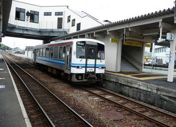 Keywords: 浜田駅2番線.JPG Hamada Station platform 2 with train bound for Izumoshi 田駅2番線ホームに 車中の出雲市行き Own ペ 家音 2009-07-30 JR West Kiha 120 Hamada Station