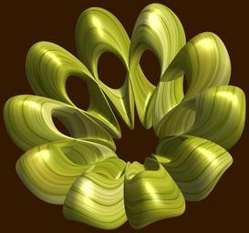 | Keywords: mathematica 3d cg parametricplot3d texture torus 輪環 りんかん ドーナツ どーなつ 五芒星 ごぼうせい 五光星 ごこうせい 五稜星 ごりょうせい code program algorithm コード プログラム アルゴリズム pentagram geometric sculpture geometricsculpture shape geometry sculpture mapping テクスチャ マッピング 模様 もよう abstract 抽象 ちゅうしょう アブストラクト design pattern デザイン パターン graphic グラフィック グラフィクス structure 意匠 構造 symmetry 対称性 たいしょうせい シンメトリー 対称 たいしょう algorithm コード indoor black background a = 3; (* center hole size *) b = 5; (* penta-torus *) c = 0; (* distance from the center of rotation *) d = 2; (* number of torus *) h = 2; (* height of a torus *) SetOptions[ParametricPlot3D, PlotRange -> Full, Mesh -> None, Boxed -> False, Axes -> False, PlotPoints -> 400, ImageSize -> 3000, Background -> Darker[Orange, 0.8], PlotStyle -> Directive[Specularity[White, 30], Texture[Import["D:/tmp/71.jpg"]]], TextureCoordinateFunction -> ({#4 + #5, #5 / Pi} &), Lighting -> "Neutral"]; f[v_] := Sin[2 Sin[Sin[Sin[v]]]]; x = (a - Cos[t] - f[b s]) Cos[s]; y = (a - Cos[t] - f[b s]) Sin[s]; z = (a - Sin[t] - h Sin[b s]) + c; rot = Table[{x, y, z}.RotationMatrix[2 i Pi/d, {0, 0, 1}], {i, d}]; ParametricPlot3D[rot, {t, 0, 2 Pi}, {s, 0, 2 Pi}] (*--- The Texture is this: www.flickr.com/photos/tanaka_juuyoh/5239255695/ *) a = 3; (* center hole size *) b = 5; (* penta-torus *) c = 0; (* distance from the center of rotation *) d = 2; (* number of torus *) h = 2; (* height of a torus *) SetOptions[ParametricPlot3D, PlotRange -> Full, Mesh -> None, Boxed -> False, Axes -> False, PlotPoints -> 400, ImageSize -> 3000, Background -> Darker[Orange, 0.8], PlotStyle -> Directive[Specularity[White, 30], Texture[Import["D:/tmp/71.jpg"]]], TextureCoordinateFunction -> ({#4 + #5, #5 / Pi} &), Lighting -> "Neutral"]; f[v_] := Sin[2 Sin[Sin[Sin[v]]]]; x = (a - Cos[t] - f[b s]) Cos[s]; y = (a - Cos[t] - f[b s]) Sin[s]; z = (a - Sin[t] - h Sin[b s]) + c; rot = Table[{x, y, z}.RotationMatrix[2 i Pi/d, {0, 0, 1}], {i, d}]; ParametricPlot3D[rot, {t, 0, 2 Pi}, {s, 0, 2 Pi}] (*--- The Texture is this: www.flickr.com/photos/tanaka_juuyoh/5239255695/ *) |
