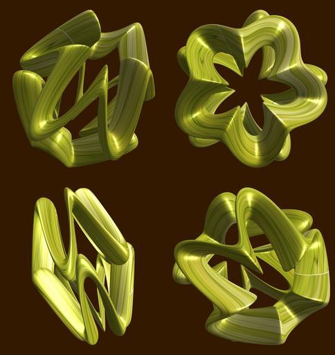 Keywords: mathematica 3d cg parametricplot3d texture torus 輪環 りんかん ドーナツ どーなつ 五芒星 ごぼうせい 五光星 ごこうせい 五稜星 ごりょうせい code program algorithm コード プログラム アルゴリズム pentagram geometric sculpture geometricsculpture shape geometry sculpture mapping テクスチャ マッピング 模様 もよう abstract 抽象 ちゅうしょう アブストラクト design pattern デザイン パターン graphic グラフィック グラフィクス structure 意匠 構造 symmetry 対称性 たいしょうせい シンメトリー 対称 たいしょう algorithm コード plant foliage leaf black background organic pattern a = 3; (* center hole size *) b = 5; (* penta-torus *) c = -6; (* distance from the center of rotation *) d = 2; (* number of torus *) h = 3; (* height of a torus *) SetOptions[ParametricPlot3D, PlotRange -> Full, Mesh -> None, Boxed -> False, Axes -> False, PlotPoints -> 400, ImageSize -> 1600, Background -> Darker[Orange, 0.8], PlotStyle -> Directive[Specularity[White, 30], Texture[Import["D:/tmp/71.jpg"]]], TextureCoordinateFunction -> ({#4 + #5, #5 / Pi} &), Lighting -> "Neutral"]; x = (a - Cos[t] - Sin[b s]) Cos[s]; y = (a - Cos[t] - Sin[b s]) Sin[s]; z = (a - Sin[t] - h Sin[b s]) + c; rot = Table[{x, y, z}.RotationMatrix[2 i Pi/d, {1, 1, 0}], {i, d}]; ParametricPlot3D[rot, {t, 0, 2 Pi}, {s, 0, 2 Pi}] (*--- The Texture is this: www.flickr.com/photos/tanaka_juuyoh/5239255695/ *) a = 3; (* center hole size *) b = 5; (* penta-torus *) c = -6; (* distance from the center of rotation *) d = 2; (* number of torus *) h = 3; (* height of a torus *) SetOptions[ParametricPlot3D, PlotRange -> Full, Mesh -> None, Boxed -> False, Axes -> False, PlotPoints -> 400, ImageSize -> 1600, Background -> Darker[Orange, 0.8], PlotStyle -> Directive[Specularity[White, 30], Texture[Import["D:/tmp/71.jpg"]]], TextureCoordinateFunction -> ({#4 + #5, #5 / Pi} &), Lighting -> "Neutral"]; x = (a - Cos[t] - Sin[b s]) Cos[s]; y = (a - Cos[t] - Sin[b s]) Sin[s]; z = (a - Sin[t] - h Sin[b s]) + c; rot = Table[{x, y, z}.RotationMatrix[2 i Pi/d, {1, 1, 0}], {i, d}]; ParametricPlot3D[rot, {t, 0, 2 Pi}, {s, 0, 2 Pi}] (*--- The Texture is this: www.flickr.com/photos/tanaka_juuyoh/5239255695/ *) |