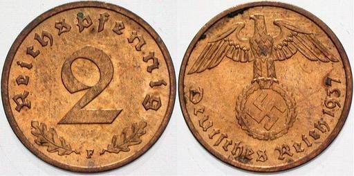 | Keywords: 2Reichspfennig1.JPG es Moneda de 2 pfennig Nazi German 2 pfennig 1/100 of a Reichsmark German coin Reichsbank photograph by Turkmenistan 1937 Coin PD-GermanGov-currency coin <br/>Photograph Reichsmark coins of the Third Reich 0002 Nazi symbol |