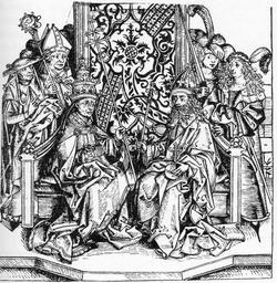 | Keywords: 307Schedelsche Chronik Papst Pius II und Kaiser Friedrich III.jpg Papst Pius II Aeneas Silvius Piccolomini und Kaiser Friedrich III <br>Schedelsche Weltchronik Wien Bildarchiv der Österreichischen Nationalbibliothek Cod 7892 fol 24 eingescannt aus Alois Niederstätter 1400 - 1522 das Jahrhundert der Mitte an der Wende vom Mittelalter zur Neuzeit aus der Reihe Österreichische Geschichte Wien 1996 ISBN 3-8000-3532-4 1493 author Reproduction of a painting that is in the public domain because of its age PD-old-100 Frederick III Holy Roman Emperor Pius II 1493 15th-century woodcuts |