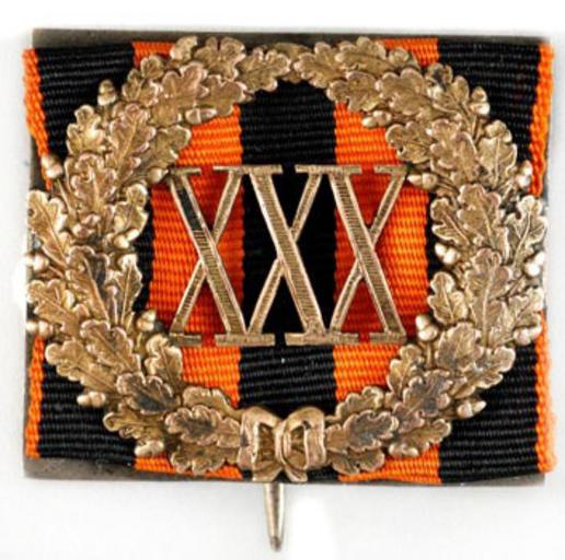 | Keywords: Знак отличия «за 30 лет беспорочной службы».jpg  ru Знак отличия беспо очной службы - установлен с 22 августа 1827 года П оисходили ежегодные пожалования знака кото ым наг аждались как военные так и штатские лица Знак п едставляет собой квад атную сквозную п яжку се еб яную с позолотой в кото ую вставлялась о денская лента Пове х ленты был ук еплен дубовый венок с латинской циф ой означавшей количество лет п оведенных на службе Other date XIX век http //medalirus ru/rus-ordena/znaki-otlichiya-za-sluzhbu php author other versions Custom license marker 2016 12 25 PD-RusEmpire Badge of the Russian Empire |