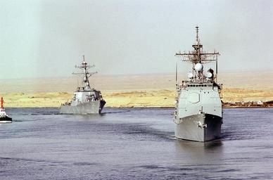 | Keywords: cvn-73-sc-10/94-#1 cvn73sc10941 uss thomas c. gates ussthomascgates uss barry ussbarry cg-51 cg51 ddg-52 ddg52 cruiser destroyer vigilant warrior vigilantwarrior suez canal suezcanal navy egypt outdoor 330-CFD-DN-SC-98-03990: Operation Vigilant Warrior, October 8-December 22, 1994. A view from the fantail of the aircraft carrier USS George Washington (CVN-73) showing the guided missile cruiser USS Thomas C. Gates (CG-51) and the guided missile destroyer USS Barry (DDG-52) as the vessels transit south through the Suez Canal into the Red Sea in response to Iraq moving troops south toward the Kuwait border, October 10, 1994. PH1 D. Miller. (OPA-NARAII-8/14/2015). 330-CFD-DN-SC-98-03990: Operation Vigilant Warrior, October 8-December 22, 1994. A view from the fantail of the aircraft carrier USS George Washington (CVN-73) showing the guided missile cruiser USS Thomas C. Gates (CG-51) and the guided missile destroyer USS Barry (DDG-52) as the vessels transit south through the Suez Canal into the Red Sea in response to Iraq moving troops south toward the Kuwait border, October 10, 1994. PH1 D. Miller. (OPA-NARAII-8/14/2015). |