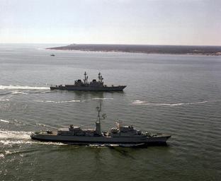 | Keywords: chesapeake bay chesapeakebay usa vehicle boat outdoor sea water waterfront landscape coast shore 330-CFD-DN-SC-82-02122: A starboard beam view of the destroyer USS Comte de Grasse (DD-974) and the French destroyer De Grasse (D-612) underway near Cape Henry on their way to Norfolk. The ships participated in the joint U.S./French bicentennial celebration at Yorktown, Virginia, 10/20/1981. (OPA-NARA II-2015/10/11). 330-CFD-DN-SC-82-02122: A starboard beam view of the destroyer USS Comte de Grasse (DD-974) and the French destroyer De Grasse (D-612) underway near Cape Henry on their way to Norfolk. The ships participated in the joint U.S./French bicentennial celebration at Yorktown, Virginia, 10/20/1981. (OPA-NARA II-2015/10/11). |