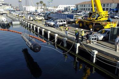 | Keywords: released san diego sandiego california (ca) californiaca united states of america (usa) unitedstatesofamericausa waterfront water outdoor 330-CFD-DN-SD-06-08467: The Seahorse Class Autonomous Underwater Vehicle (AUV) from the Applied Research Laboratory at Penn State University (PSU) is lowered into the water prior to undergoing launch and recovery testing with Sea Fighter (FSF-1). At 28 feet, six inches, and weighing 10,800 pounds, Seahorse is an untethered, unmanned, underwater robotic vehicle, capable of pre-programmed independent operations. The Office of Naval Research (ONR) is sponsoring this demonstration, 1/30/2006. . U.S. Navy photograph, now in the collections of the National Archives: Online Public Access. 330-CFD-DN-SD-06-08467: The Seahorse Class Autonomous Underwater Vehicle (AUV) from the Applied Research Laboratory at Penn State University (PSU) is lowered into the water prior to undergoing launch and recovery testing with Sea Fighter (FSF-1). At 28 feet, six inches, and weighing 10,800 pounds, Seahorse is an untethered, unmanned, underwater robotic vehicle, capable of pre-programmed independent operations. The Office of Naval Research (ONR) is sponsoring this demonstration, 1/30/2006. . U.S. Navy photograph, now in the collections of the National Archives: Online Public Access. |