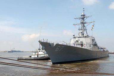 | Keywords: pat dolan, pao, navsea (release patdolanpaonavsearelease ingalls shipyard, pascagoula ingallsshipyardpascagoula mississippi (ms) mississippims united states of america (usa) unitedstatesofamericausa vehicle outdoor ship boat 330-CFD-DN-SD-04-09198: Starboard side view of the US Navy (USN) ARLEIGH BURKE CLASS (FLIGHT I) GUIDED MISSILE DESTROYER (AEGIS), USS COLE (DDG 67), with Sailors manning the rail as the ship get assistance from a commercial tug boat, as it prepares to rejoin the fleet following 14 months of repairs at the Northrop Grumman Ship Systems, Ingalls Operations, Pascagoula, Mississippi (MS). Visible is her newly restored portside hull and superstructure, repaired after a terrorist bomb blew a hole in her port side while refueling in the port city of Aden, Yemen, 04/19/2002. Official U.S. Navy photograph, now in the collections of the U.S. National Archives: Public Online Access. 330-CFD-DN-SD-04-09198: Starboard side view of the US Navy (USN) ARLEIGH BURKE CLASS (FLIGHT I) GUIDED MISSILE DESTROYER (AEGIS), USS COLE (DDG 67), with Sailors manning the rail as the ship get assistance from a commercial tug boat, as it prepares to rejoin the fleet following 14 months of repairs at the Northrop Grumman Ship Systems, Ingalls Operations, Pascagoula, Mississippi (MS). Visible is her newly restored portside hull and superstructure, repaired after a terrorist bomb blew a hole in her port side while refueling in the port city of Aden, Yemen, 04/19/2002. Official U.S. Navy photograph, now in the collections of the U.S. National Archives: Public Online Access. |