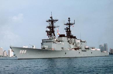 | Keywords: unknown vehicle outdoor boat ship 330-CFD-DN-ST-90-01494: A port view of the destroyer USS Thorn (DD 988) entering a port during the multinational naval Exercise UNITAS XXV, 1/1/1984. PHC Terry C. Mitchell, USN. (OPA-NARA II-2015/10/15). 330-CFD-DN-ST-90-01494: A port view of the destroyer USS Thorn (DD 988) entering a port during the multinational naval Exercise UNITAS XXV, 1/1/1984. PHC Terry C. Mitchell, USN. (OPA-NARA II-2015/10/15). | ||||