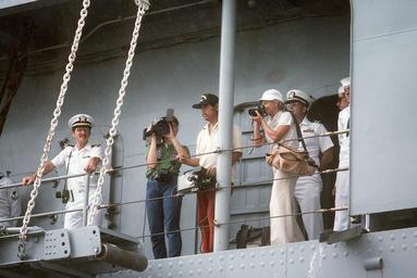 | Keywords: apra harbor apraharbor guam (gu) guamgu northern mariana islands (mnp) northernmarianaislandsmnp 330-CFD-DN-ST-85-11054: Photographers and crewmen aboard the docked combat stores ship USS Niagra Falls (AFS 3) observe welcoming activities for the ship. The Niagara Falls has just arrived at Naval Station Guam, 9/28/1983 Northern Mariana Islands (MNP). (OPA-NARA II-2016/01/26). 330-CFD-DN-ST-85-11054: Photographers and crewmen aboard the docked combat stores ship USS Niagra Falls (AFS 3) observe welcoming activities for the ship. The Niagara Falls has just arrived at Naval Station Guam, 9/28/1983 Northern Mariana Islands (MNP). (OPA-NARA II-2016/01/26). |