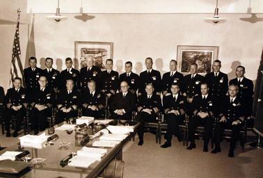 | Keywords: group performance indoor 330-PS-1290 (USN 708197): Naval Reserve Policy Board Holds Annual Meeting. Various Naval Districts and Naval Officials in Washington, D.C. met in the Pentagon on April 9, 1951, to open their annual two week meeting for the purpose of formulating plans and policies for future operations of the U.S. Naval Reserve program. The board, headed by Secretary of the Navy Francis P. Matthews, included Admiral Forrest P. Sherman, Vice Admiral Laurence T. Dubose, Chief of Naval Personnel, and Rear Admiral R.S. Riggs, Administrative Chief of Operations for the Naval Reserve. The Members of the Board: (front row, left to right): Captain F.B. Kirk, Third Naval District; Captain W.A. Neil, Fourth Naval District; Rear Admiral Rigs, Admiral Sherman, Secretary of the Navy Matthews; Vice Admiral Dubose; Captain John. H. Schultz, Assistant Chief of Naval Personnel; Commander E. H. Sutter, Sixth Naval District; and Commander John R. Hoyt, Commander of Naval Air Reserve Training Delegate. (Rear row, left to right): Commander L. M. King, Eleventh Naval District; Captain R.L. Johnson, Ninth Naval District; Commander P.G. Moltani, Bureau of Personnel (training) Delegate; Captain Edmund B. Taylor, Bureau of Personnel Delegate; Commander G.E. Glassock, Fifth Naval District; Captain Neal P. Pendleton, Eighth Naval District; Commander C.G. Pell, Fourteenth Naval District; Commander Jim K. Carpenter, Thirteenth Naval District; Captain Albert Berry, Twelfth Naval District; Lieutenant Commander A.A. Libbey, First Naval District, and Lieutenant Commander H.P. Ruben, Recorder. Photograph released April 11, 1951. (6/16/2015). 330-PS-1290 (USN 708197): Naval Reserve Policy Board Holds Annual Meeting. Various Naval Districts and Naval Officials in Washington, D.C. met in the Pentagon on April 9, 1951, to open their annual two week meeting for the purpose of formulating plans and policies for future operations of the U.S. Naval Reserve program. The board, headed by Secretary of the Navy Francis P. Matthews, included Admiral Forrest P. Sherman, Vice Admiral Laurence T. Dubose, Chief of Naval Personnel, and Rear Admiral R.S. Riggs, Administrative Chief of Operations for the Naval Reserve. The Members of the Board: (front row, left to right): Captain F.B. Kirk, Third Naval District; Captain W.A. Neil, Fourth Naval District; Rear Admiral Rigs, Admiral Sherman, Secretary of the Navy Matthews; Vice Admiral Dubose; Captain John. H. Schultz, Assistant Chief of Naval Personnel; Commander E. H. Sutter, Sixth Naval District; and Commander John R. Hoyt, Commander of Naval Air Reserve Training Delegate. (Rear row, left to right): Commander L. M. King, Eleventh Naval District; Captain R.L. Johnson, Ninth Naval District; Commander P.G. Moltani, Bureau of Personnel (training) Delegate; Captain Edmund B. Taylor, Bureau of Personnel Delegate; Commander G.E. Glassock, Fifth Naval District; Captain Neal P. Pendleton, Eighth Naval District; Commander C.G. Pell, Fourteenth Naval District; Commander Jim K. Carpenter, Thirteenth Naval District; Captain Albert Berry, Twelfth Naval District; Lieutenant Commander A.A. Libbey, First Naval District, and Lieutenant Commander H.P. Ruben, Recorder. Photograph released April 11, 1951. (6/16/2015). |