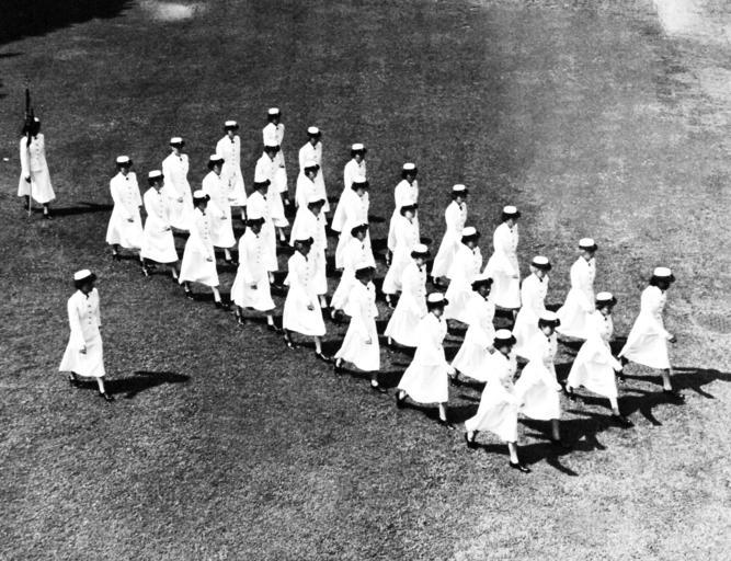Keywords: blackandwhite monochrome outdoor black and white 330-PS-2877 (USN 708652): Ten Years of the WAVY Blue: Drill Team. The WAVES have been famous for their drill teams, one of which was recently featured in a movie. The WAVE Drill Team of the Naval Training Center at Bainbridge, Maryland, sticks out as they begin one of the many formations executed by the 34 WAVE Trainees. This drill formation, like the formations used going to classes, help the nautically minded women volunteers to better understand the necessity for a smart trim unit needed to win the competitive honors awarded WAVE companies going through their “Boot Camp.” Photograph released July 24, 1952. (5/12/2015). 330-PS-2877 (USN 708652): Ten Years of the WAVY Blue: Drill Team. The WAVES have been famous for their drill teams, one of which was recently featured in a movie. The WAVE Drill Team of the Naval Training Center at Bainbridge, Maryland, sticks out as they begin one of the many formations executed by the 34 WAVE Trainees. This drill formation, like the formations used going to classes, help the nautically minded women volunteers to better understand the necessity for a smart trim unit needed to win the competitive honors awarded WAVE companies going through their “Boot Camp.” Photograph released July 24, 1952. (5/12/2015). |