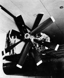 | Keywords: blackandwhite monochrome airplane vehicle aircraft black and white 330-PS-326 (USN 707777): Navy’s New Eight-Blades Contra-Rotating Aircraft Propeller’s. One of the largest aircraft propellers ever developed for the Navy in an experimental eight-bladed contra-rotating installation for use with gas turbine engines of over 6,000 horse-power. The huge propeller was built for the Navy by the Hamilton Standard Division, United Aircraft Corporation at their East Hartford, Connecticut, plant and has successfully completed 400 hours of testing. Further testing will be conducted by the Navy. The blades are 14 feet in diameter on this new propeller. Testing has been carried out with the propeller installed on a conventional piston engine, the Pratt and Whitney Wasp Major. This was the first eight-blade dual-rotation propeller developed for the Navy, and is part of the Navy’s continuing development program of turbo-propeller engines in the country. The new propeller consists of two four-bladed propellers one placed in front of the other on a dual shaft and geared to turn in opposition direction. This eliminates the “torque” effect of propeller driven aircraft. Photograph released June 14, 1950. (7/22/2015). 330-PS-326 (USN 707777): Navy’s New Eight-Blades Contra-Rotating Aircraft Propeller’s. One of the largest aircraft propellers ever developed for the Navy in an experimental eight-bladed contra-rotating installation for use with gas turbine engines of over 6,000 horse-power. The huge propeller was built for the Navy by the Hamilton Standard Division, United Aircraft Corporation at their East Hartford, Connecticut, plant and has successfully completed 400 hours of testing. Further testing will be conducted by the Navy. The blades are 14 feet in diameter on this new propeller. Testing has been carried out with the propeller installed on a conventional piston engine, the Pratt and Whitney Wasp Major. This was the first eight-blade dual-rotation propeller developed for the Navy, and is part of the Navy’s continuing development program of turbo-propeller engines in the country. The new propeller consists of two four-bladed propellers one placed in front of the other on a dual shaft and geared to turn in opposition direction. This eliminates the “torque” effect of propeller driven aircraft. Photograph released June 14, 1950. (7/22/2015). |