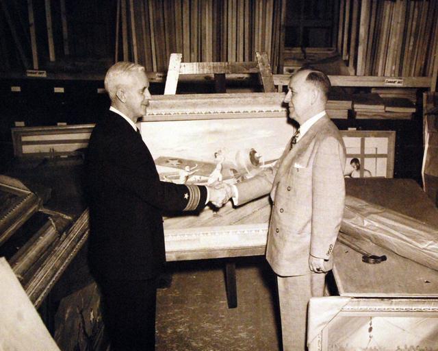 | Keywords: 330-PS-49 (USN 707551): U.S. Navy Receives Art Collection. Rear Admiral John B. Heffernan, USN, (Ret), Director of Naval Records, Historical Division, extends the Navy’s thanks to Mr. J. Frank Richmond (right), who presented the Abbott Collection to the U.S. Navy Department on behalf of the Abbott Laboratories, Incorporated, of N. Chicago, Illinois. Valued at a half-million dollars (at that time), the collection, consisting of 256 paintings in oil, water color, ink, charcoal, and crayon, was the work of fourteen outstanding American artists who depicted the activities of the Navy in World War II. Due to his admiration of the U.S. Navy, Mr. G. DeWitt Clough, Chairman of the Board of Directors of the Laboratories, prompted the donation of the Abbott Collection. Mr. Richmond is the Eastern Divisional Sales Manager of the Laboratories. Photograph released January 30, 1950. (8/18/2015). 330-PS-49 (USN 707551): U.S. Navy Receives Art Collection. Rear Admiral John B. Heffernan, USN, (Ret), Director of Naval Records, Historical Division, extends the Navy’s thanks to Mr. J. Frank Richmond (right), who presented the Abbott Collection to the U.S. Navy Department on behalf of the Abbott Laboratories, Incorporated, of N. Chicago, Illinois. Valued at a half-million dollars (at that time), the collection, consisting of 256 paintings in oil, water color, ink, charcoal, and crayon, was the work of fourteen outstanding American artists who depicted the activities of the Navy in World War II. Due to his admiration of the U.S. Navy, Mr. G. DeWitt Clough, Chairman of the Board of Directors of the Laboratories, prompted the donation of the Abbott Collection. Mr. Richmond is the Eastern Divisional Sales Manager of the Laboratories. Photograph released January 30, 1950. (8/18/2015). |