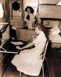 | Keywords: people 330-PS-6215 (USN 709038): Evenings and spare time isn’t always spent in recreation. In their cabin on board USNS George M. Goethals (T-AP-182) , both WAVES have personal things to care for. While Hospital Corpsman Third Class Maria A. Myers ponders over what to say in that special letter, Hospital Corpsman Second Class Eileen Paluzzi irons her smock. Photograph released October 26, 1953. Master Caption: Navy Accepts Women Volunteers for Duty on the High Seas. For the first time in history, the U.S. Navy has accepted volunteers for duty on the high seas from women in the enlisted WAVES. Those eligible were WAVES of the Hospital Corps to fill sixty-three billets on ships of the Military Sea Transportation Service. (4/21/2015). 330-PS-6215 (USN 709038): Evenings and spare time isn’t always spent in recreation. In their cabin on board USNS George M. Goethals (T-AP-182) , both WAVES have personal things to care for. While Hospital Corpsman Third Class Maria A. Myers ponders over what to say in that special letter, Hospital Corpsman Second Class Eileen Paluzzi irons her smock. Photograph released October 26, 1953. Master Caption: Navy Accepts Women Volunteers for Duty on the High Seas. For the first time in history, the U.S. Navy has accepted volunteers for duty on the high seas from women in the enlisted WAVES. Those eligible were WAVES of the Hospital Corps to fill sixty-three billets on ships of the Military Sea Transportation Service. (4/21/2015). |