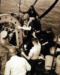 | Keywords: 330-PS-629 (USN 707940): U.S. Navy pilot rescued two miles off North Korean coast. In making an attack on shipping in North Korea port of Wonsan, Task Force 77 “Corsair” pilot Lieutenant Junior Grade Nathan E. Curry was hit by flak and forced to parachute into the water. A plane in company radioed a patrolling destroyer for help. Two and hone half hours later, the badly burned pilot was picked-up from his one-man raft by the destroyer. During the rescue operation, the destroyer was under threat of an attack by enemy plane, but the plane was driven off by planes of Task Force 77. He was given emergency medical treatment and the next day was transferred back to his carrier. The U.S. Navy ships were not identified. Photograph released August 1950. (7/14/2015). 330-PS-629 (USN 707940): U.S. Navy pilot rescued two miles off North Korean coast. In making an attack on shipping in North Korea port of Wonsan, Task Force 77 “Corsair” pilot Lieutenant Junior Grade Nathan E. Curry was hit by flak and forced to parachute into the water. A plane in company radioed a patrolling destroyer for help. Two and hone half hours later, the badly burned pilot was picked-up from his one-man raft by the destroyer. During the rescue operation, the destroyer was under threat of an attack by enemy plane, but the plane was driven off by planes of Task Force 77. He was given emergency medical treatment and the next day was transferred back to his carrier. The U.S. Navy ships were not identified. Photograph released August 1950. (7/14/2015). |