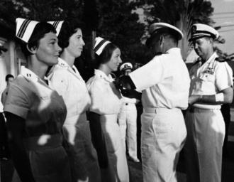 | Keywords: blackandwhite monochrome outdoor black and white 330-PSA-12-65 (KN-10517): There of the four U.S. Navy Nurses awarded the Purple Heart in Vietnam, receive their awards from Captain Archie Kuntze, Commanding Officer, U.S. Naval Support Activity, Saigon. The nurses (left to right): Lieutenant Barbara J. Wooster; Lieutenant Ruth A. Mason; and Lieutenant Junior Grade D. Reynolds, are the first women to receive the medal in Vietnam. Another nurse Lieutenant Francis L. Crumpton, was flown to Clark Air Base, Philippines, earlier for treatment. The nurses, although injured in the Communist bombing of the HQ on Christmas Eve, refused medical treatment for themselves while rendering First Aid to others wounded by the explosion. Commander Miles D. Turley, Executive Officer of the Naval Support Activity (right), assists his Commanding Officer in the presentation. Turley was wounded New Year’s Day while investigating reports of sniper fire on water skiers in the Saigon River. Photograph released January 15, 1965. (2015/11/10). (Black and White Only). 330-PSA-12-65 (KN-10517): There of the four U.S. Navy Nurses awarded the Purple Heart in Vietnam, receive their awards from Captain Archie Kuntze, Commanding Officer, U.S. Naval Support Activity, Saigon. The nurses (left to right): Lieutenant Barbara J. Wooster; Lieutenant Ruth A. Mason; and Lieutenant Junior Grade D. Reynolds, are the first women to receive the medal in Vietnam. Another nurse Lieutenant Francis L. Crumpton, was flown to Clark Air Base, Philippines, earlier for treatment. The nurses, although injured in the Communist bombing of the HQ on Christmas Eve, refused medical treatment for themselves while rendering First Aid to others wounded by the explosion. Commander Miles D. Turley, Executive Officer of the Naval Support Activity (right), assists his Commanding Officer in the presentation. Turley was wounded New Year’s Day while investigating reports of sniper fire on water skiers in the Saigon River. Photograph released January 15, 1965. (2015/11/10). (Black and White Only). |