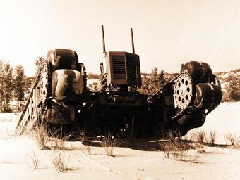 | Keywords: outdoor monochrome 330-PSA-142-62 (USN 711080): The “Airoll” proved itself in the sand. On reaching soft terrain, the wheels automatically became stationary, with the pneumatic tires serving as cleats or crippers in the manner of tracked vehicles. The report on the testing of the 19,000 pound test platform noted the Airoll system can “achieve greater travel efficiency on most soil conditions than conventional wheeled or tracked vehicles. Master Caption: This multi-wheeled, rubber-tired behemoth is the test platform for a new concept in off-the-road transport known as the “Airoll.” Developed for the U.S. Navy under a contract with the Office of Naval Research, the Airoll is the first successful mating of the track and wheel. It was originally conceived by the Ingersoll, Kalamazoo Division of the Borg-Warner Corporation. The free-rolling tires mounted on an endless chain can take the vehicle easily over ordinary impassable terrain, such as deep mud, heavy snow, and watery swamplands. The Marine Corps has ordered eight one-half ton amphibious versions to be used as personnel/weapons carriers. Photograph released June 18, 1962. (10/6/2015). 330-PSA-142-62 (USN 711080): The “Airoll” proved itself in the sand. On reaching soft terrain, the wheels automatically became stationary, with the pneumatic tires serving as cleats or crippers in the manner of tracked vehicles. The report on the testing of the 19,000 pound test platform noted the Airoll system can “achieve greater travel efficiency on most soil conditions than conventional wheeled or tracked vehicles. Master Caption: This multi-wheeled, rubber-tired behemoth is the test platform for a new concept in off-the-road transport known as the “Airoll.” Developed for the U.S. Navy under a contract with the Office of Naval Research, the Airoll is the first successful mating of the track and wheel. It was originally conceived by the Ingersoll, Kalamazoo Division of the Borg-Warner Corporation. The free-rolling tires mounted on an endless chain can take the vehicle easily over ordinary impassable terrain, such as deep mud, heavy snow, and watery swamplands. The Marine Corps has ordered eight one-half ton amphibious versions to be used as personnel/weapons carriers. Photograph released June 18, 1962. (10/6/2015). |