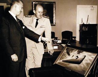 | Keywords: indoor 330-PSA-172-61 (USN 710955): Rear Admiral Daniel F. Smith, Jr., USN, Navy Chief of Information, right, accepts the original oil painting from an RCA advertisement hailing USS Seadragon’s east-to-west voyage under the polar ice gap in 1960 from Max Lehrer, Manager, RCA’s Washington Defense Office, August 11, 1961, at the Pentagon. Admiral Smith accepted in behalf of Seadragon’s Commanding Officer, Commander Steele II, USN, and the submarine’s crew. Mr. Lehrer expressed RCA’s pride in having been associated with the Seadragon’s voyage as supplier of a unique video tape recorder which rode a torpedo rack of the submarine during its historic voyage, recording and storing data on under-the-ice characteristics from externally installed TV cameras. The Seadragon’s visit to the North Pole was the fourth by a United States nuclear submarine. It was the first, however, to be equipped with closed-circuit TV secured to its exterior. For 44 days, the submarine’s television “eyes” helped guide it under icepacks too crowded to surface through, enabled it at one point to find passage under a mass of ice estimated at more than three million tones. When the 265-foot sub had completed it historic voyage, it held the distinction of having trail-blazed a possible new military and commercial route through the Northwest Passage. Photograph released August 14, 1961. (9/22/2015). 330-PSA-172-61 (USN 710955): Rear Admiral Daniel F. Smith, Jr., USN, Navy Chief of Information, right, accepts the original oil painting from an RCA advertisement hailing USS Seadragon’s east-to-west voyage under the polar ice gap in 1960 from Max Lehrer, Manager, RCA’s Washington Defense Office, August 11, 1961, at the Pentagon. Admiral Smith accepted in behalf of Seadragon’s Commanding Officer, Commander Steele II, USN, and the submarine’s crew. Mr. Lehrer expressed RCA’s pride in having been associated with the Seadragon’s voyage as supplier of a unique video tape recorder which rode a torpedo rack of the submarine during its historic voyage, recording and storing data on under-the-ice characteristics from externally installed TV cameras. The Seadragon’s visit to the North Pole was the fourth by a United States nuclear submarine. It was the first, however, to be equipped with closed-circuit TV secured to its exterior. For 44 days, the submarine’s television “eyes” helped guide it under icepacks too crowded to surface through, enabled it at one point to find passage under a mass of ice estimated at more than three million tones. When the 265-foot sub had completed it historic voyage, it held the distinction of having trail-blazed a possible new military and commercial route through the Northwest Passage. Photograph released August 14, 1961. (9/22/2015). |
