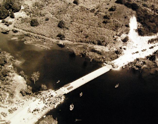 | Keywords: outdoor 330-PSA-293-60 (USN 1051356): Bridge Built by U.S. Navy Seabees dedicated at Lake Miraogoane, Haiti. Aerial view of Dedication Ceremonies at Navy-built bridge, Miragoane, Haiti, November 22, 1960. Master Caption: Representatives of the Government of the United States and Haiti dedicated a U.S. Navy Seabee-built bridge that spans the flooded Lake Miraogoane near Mira, Haiti, November 22, 1960. Among the dignitaries attending were U.S. Ambassador to Haiti and the Haitian Minister of Public Works, Marcel Daumec. Haitian Army engineers called the U.S. for help last summer when an unusual rainfall caused the lake to rise and virtually isolate the southern tip of Haiti. The single highway access to the area was flooded and a result of the western side of the southern peninsula was isolated. A Seabee Detachment from Amphibious Construction Battalion Two (ACB-2), was rushed to the area with supplies to build a pontoon bridge across the flooded sections and improve six miles of road in the bridge approaches. The ACB-2 Unit encountered a two-acre floating island of debris blocking access channels to the bridge. The “Can Do” Seabees blasted the “islands” into sections and then used pontoons and propulsion unit to push the debris to the shoreline. Approval and funds for the project were provided by the International Cooperation Administration, though a cooperative arrangement with the Haitian Government, to the U.S. Navy Department. Photograph released December 2, 1960. (9/15/15). 330-PSA-293-60 (USN 1051356): Bridge Built by U.S. Navy Seabees dedicated at Lake Miraogoane, Haiti. Aerial view of Dedication Ceremonies at Navy-built bridge, Miragoane, Haiti, November 22, 1960. Master Caption: Representatives of the Government of the United States and Haiti dedicated a U.S. Navy Seabee-built bridge that spans the flooded Lake Miraogoane near Mira, Haiti, November 22, 1960. Among the dignitaries attending were U.S. Ambassador to Haiti and the Haitian Minister of Public Works, Marcel Daumec. Haitian Army engineers called the U.S. for help last summer when an unusual rainfall caused the lake to rise and virtually isolate the southern tip of Haiti. The single highway access to the area was flooded and a result of the western side of the southern peninsula was isolated. A Seabee Detachment from Amphibious Construction Battalion Two (ACB-2), was rushed to the area with supplies to build a pontoon bridge across the flooded sections and improve six miles of road in the bridge approaches. The ACB-2 Unit encountered a two-acre floating island of debris blocking access channels to the bridge. The “Can Do” Seabees blasted the “islands” into sections and then used pontoons and propulsion unit to push the debris to the shoreline. Approval and funds for the project were provided by the International Cooperation Administration, though a cooperative arrangement with the Haitian Government, to the U.S. Navy Department. Photograph released December 2, 1960. (9/15/15). |