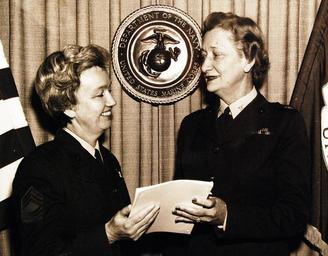 | Keywords: groupshot people indoor 330-PSA-372-62 (USMC A-410756): First enlisted woman Marine retires – Master Sergeant Catherine G. Murray discusses her retirement plans with Colonel Margaret Henderson, Director of Women Marines. Master Sergeant Murray will become the first enlisted woman Marine to retire from active duty after completing nearly 20 years of service on November 30. Photograph released November 29, 1962. (2015/10/13). 330-PSA-372-62 (USMC A-410756): First enlisted woman Marine retires – Master Sergeant Catherine G. Murray discusses her retirement plans with Colonel Margaret Henderson, Director of Women Marines. Master Sergeant Murray will become the first enlisted woman Marine to retire from active duty after completing nearly 20 years of service on November 30. Photograph released November 29, 1962. (2015/10/13). |