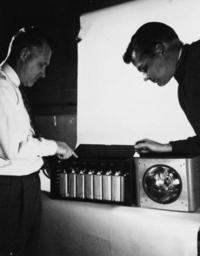 | Keywords: blackandwhite monochrome black and white 330-PSA-37-61 (USN 1053086): High Intensity Electronic Flash Developed by Naval Ordnance Laboratory. NOL Engineering Aide, Benjamin J. Crapo (left), indicates the artificial transmission line of a high intensity electronic flash recently developed to light missile models undergoing re-entry airflow tests. With his hand on the flash lamp is Lemmuel L. Hill, NOL physicist, who helped develop the flash. Theodore Marshall, (not pictured), also aided in the project. Photograph released February 15, 1961. (9/15/15). 330-PSA-37-61 (USN 1053086): High Intensity Electronic Flash Developed by Naval Ordnance Laboratory. NOL Engineering Aide, Benjamin J. Crapo (left), indicates the artificial transmission line of a high intensity electronic flash recently developed to light missile models undergoing re-entry airflow tests. With his hand on the flash lamp is Lemmuel L. Hill, NOL physicist, who helped develop the flash. Theodore Marshall, (not pictured), also aided in the project. Photograph released February 15, 1961. (9/15/15). |