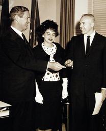 | Keywords: indoor 330-PSA-74-61 (USN 710883): Dr. James – Oceanographer Receives $5,435 Award. Dr. Richard W. James, (right), an oceanographer in the Navy’s Hydrographic Office, received a $5,435 check from Secretary of the Navy John B. Connally, as Mrs. James looks on. The check was awarded today to Dr. James for research leading to a system of ship routing around bad weather areas which was resulted in annual savings to the Navy of $10,000,000. The system resulting from Dr. James’ research is called “Optimum Track Ship Routing” and is based on the application of long-range weather forecasts to the known performance of ships in various weather conditions. Selecting the best course for a ship to follow results in maximum ship and cargo safety, passenger comfort, minimum fuel consumption, and travel time. The applications of Dr. James’ research to actual ship crossings has produced spectacular results. Ships routed by this method have arrived at their destination an average of 14.5 hours ahead of vessels following the normal seasonal routes. The Military Sea Transportation Service, first agency to use the system, has realized savings over $2,000,000 per year in time saved, increased safety of ship, cargo and passengers, and more consistent and stringent schedules. From long-range prediction of wind, waves, and currents, an optimum route is plotted to avoid storms, rough seas, or high winds. At present, Dr. James heads the Forecast Central at the Hydrographic Office and is responsible for proving oceanographic forecast to the fleet. Photograph released April 14, 1961. (9/15/15). 330-PSA-74-61 (USN 710883): Dr. James – Oceanographer Receives $5,435 Award. Dr. Richard W. James, (right), an oceanographer in the Navy’s Hydrographic Office, received a $5,435 check from Secretary of the Navy John B. Connally, as Mrs. James looks on. The check was awarded today to Dr. James for research leading to a system of ship routing around bad weather areas which was resulted in annual savings to the Navy of $10,000,000. The system resulting from Dr. James’ research is called “Optimum Track Ship Routing” and is based on the application of long-range weather forecasts to the known performance of ships in various weather conditions. Selecting the best course for a ship to follow results in maximum ship and cargo safety, passenger comfort, minimum fuel consumption, and travel time. The applications of Dr. James’ research to actual ship crossings has produced spectacular results. Ships routed by this method have arrived at their destination an average of 14.5 hours ahead of vessels following the normal seasonal routes. The Military Sea Transportation Service, first agency to use the system, has realized savings over $2,000,000 per year in time saved, increased safety of ship, cargo and passengers, and more consistent and stringent schedules. From long-range prediction of wind, waves, and currents, an optimum route is plotted to avoid storms, rough seas, or high winds. At present, Dr. James heads the Forecast Central at the Hydrographic Office and is responsible for proving oceanographic forecast to the fleet. Photograph released April 14, 1961. (9/15/15). |