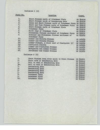 | Keywords: 36093 Photo Guide 1 - NARA - 6003824.jpg Scope and content General notes 6003824 Local identifier Inclosure 1 U 36093 Photo Gu / MLR Number A-1 3006 Department of Defense Department of the Army U S Army Europe U S Army Berlin Berlin Brigade 12/01/1961 - ca 1992 Most Recent <br/> <br/> Department of Defense Department of the Army U S Army Europe Berlin Command 05/01/1948 - 12/01/1961 Predecessor Archives II Reference Section Military Textual Archives Services Division NWCT2RM National Archives at College Park 8601 Adelphi Road College Park MD 20740-6001 Record group Record Group 549 Records of United States Army Europe 1942 - 1991 Record group ARC 560363 File Unit nbsp;Inclosure 1 U 11/1961 - 11/1961 <br/> <br/> MLR Number A-1 3006 Series ARC 6003823 File unit File unit ARC Variant control numbers Declassification Project Number NND 36093<br/> HMS/MLR Entry Number A1 3006<br/> Search Identifier A City Torn Apart Building of the Berlin Wall<br/> Search Identifier siBerlin61<br/> Search Identifier The Berlin Crisis of 1961 Building the Wall From Vienna to Checkpoint Charlie Other versions NARA-cooperation PD-USGov United States |