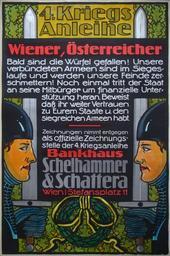 | Keywords: 3-2 Sammlung Eybl (Slg.Nr. 2268) Plakat 4. Kriegsanleihe 1916.jpg Ă–sterreich “ Ungarn Anonym 4 Kriegsanleihe 1916 121 x 80 cm Slg Nr 2268 Der euphorische Text fordert die BĂĽrger der Heimat auf noch einmal den Staat finanziell zu unterstĂĽtzen und in den Sieg zu vertrauen Bis zur tatsächlichen Niederlage vergingen noch zwei Jahre und folgten vier weitere Kriegsanleihen Die Ritter an den Plakatseiten sollten das Bild eines žritterlichen Krieges erzeugen Diese oft verwendeten Symbole waren eine bewusste IrrefĂĽhrung Austria-Hungary Anonymous 4 War Bond 121 x 80 cm 1916 Slg Nr 2268 The euphoric text calls on the citizens of the homeland once again to support the government financially and to trust in the victory Until the actual defeat took another two years and was followed by four more war bonds The Knights of the poster sides should create the image of a chivalrous war These symbols often used were a deliberate deception Sammlung Eybl Plakatmuseum Wien 2009-11-28 12 45 58 A Erhardt Credit line Eybl Plakatmuseum Wien/Wikimedia Commons CC-BY-SA-4 0 wiki Sammlung Eybl Plakatmuseum Wien PD-old-100-1923 World War I posters of Austria-Hungary War bonds Plakatmuseum Wien Eybl Collection |