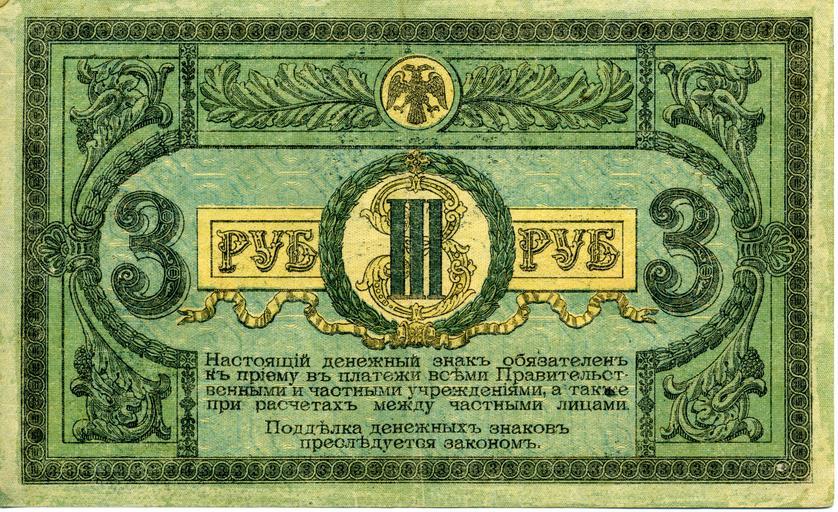 | Keywords: Донские деньги - 3 рубля реверс 1918. Ростов.jpg en Russian Don banknote 3 rubles 1918 year Back ru Банкнота Донской области достоинством 3 убля об азца 1918 года scanned note from own personal collection П авительство Донской области/Ростовская конто а Госбанка 1918 1918 currency Banknotes of Don 1918 Banknotes with a face value of 3 Green banknotes |