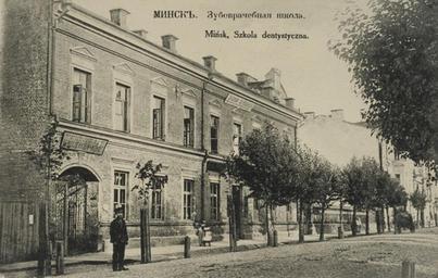 | Keywords: Вуліца Валадарскага,3.jpg Вуліца Валада скага Дом 3 Зубная ляка ня на ста ых паштоўках пачатку 20-га стагодззя Паміж дамамі бачны часткі фасада Ха альнай сінагогі http //www oldmensk net/publ/vulicy/valadarskaga/vul_valadarskaga_dom_03/39-1-0-305 century 20 PD-old Valadarskaha street Minsk |