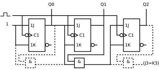 | Keywords: 3 bit up synchronous counter.svg en Negative edge-triggered JK flip-flop based 3 bit up synchronous counter es Contador síncrono ascendente de 3 bits basado en flip-flops JK sincronizados por flanco descendente own Dizquierdol Made with Dia v0 97 1 Cc-zero Counter circuits |