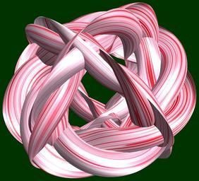 | Keywords: mathematica 3d cg parametricplot3d texture torus 輪環 りんかん ドーナツ どーなつ 七芒星 しちぼうせい 七光星 しちこうせい 七稜星 しちりょうせい program プログラム code コード algorithm コード アルゴリズム geometric sculpture geometricsculpture shape geometry sculpture mapping テクスチャ マッピング 模様 もよう design pattern デザイン パターン graphic グラフィック グラフィクス structure 意匠 構造 symmetry 対称性 たいしょうせい シンメトリー 対称 たいしょう algorithm bright pastel SetOptions[ParametricPlot3D, PlotRange -> Full, Mesh -> None, Boxed -> False, Axes -> None, PlotPoints -> 400, ImageSize -> 3000, Background -> Darker[Green, 0.8], PlotStyle -> Directive[Specularity[White, 30], Texture[Import["D:/tmp/86.jpg"]]], TextureCoordinateFunction -> ({#4 + #5, #5/Pi} &), Lighting -> "Neutral"]; a = 5; (* center hole size of a torus *) b = 7; (* hepta-torus *) d = 3; (* number of torus *) v = 3; w = 0.5; x = (a - Cos[w t] - Sin[b s]) Cos[v s]; y = Sin[w t] Cos[b s]; z = (a - Cos[w t] - Sin[b s]) Sin[v s]; rot = Table[{x, y, z}.RotationMatrix[2 i Pi/d, {1, 1, 1}], {i, d}]; ParametricPlot3D[rot, {t, 0, 2 Pi}, {s, 0, 2 Pi}] (*--- The Texture *) SetOptions[ParametricPlot3D, PlotRange -> Full, Mesh -> None, Boxed -> False, Axes -> None, PlotPoints -> 400, ImageSize -> 3000, Background -> Darker[Green, 0.8], PlotStyle -> Directive[Specularity[White, 30], Texture[Import["D:/tmp/86.jpg"]]], TextureCoordinateFunction -> ({#4 + #5, #5/Pi} &), Lighting -> "Neutral"]; a = 5; (* center hole size of a torus *) b = 7; (* hepta-torus *) d = 3; (* number of torus *) v = 3; w = 0.5; x = (a - Cos[w t] - Sin[b s]) Cos[v s]; y = Sin[w t] Cos[b s]; z = (a - Cos[w t] - Sin[b s]) Sin[v s]; rot = Table[{x, y, z}.RotationMatrix[2 i Pi/d, {1, 1, 1}], {i, d}]; ParametricPlot3D[rot, {t, 0, 2 Pi}, {s, 0, 2 Pi}] (*--- The Texture *) |