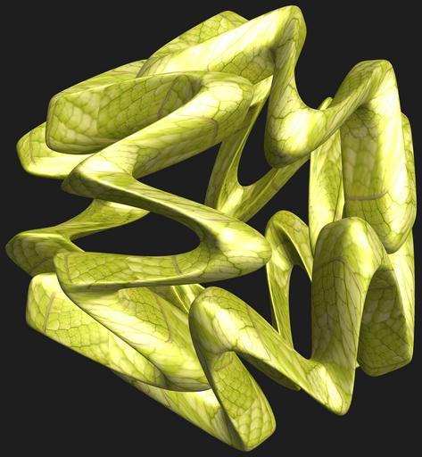 | Keywords: mathematica 3d cg parametricplot3d texture torus 輪環 りんかん ドーナツ どーなつ 六芒星 ろくぼうせい 六光星 ろくこうせい 六稜星 ろくりょうせい code program algorithm コード プログラム アルゴリズム hexagram geometric sculpture geometricsculpture shape geometry sculpture mapping テクスチャ マッピング 模様 もよう abstract 抽象 ちゅうしょう アブストラクト design pattern デザイン パターン graphic グラフィック グラフィクス structure 意匠 構造 symmetry 対称性 たいしょうせい シンメトリー 対称 たいしょう algorithm コード foliage plant leaf black background organic pattern a = 4; (* center hole size of a torus *) b = 6; (* hexa-torus *) c = -8; (* distance from the center of rotation *) d = 3; (* number of torus *) h = 2; (* height of a torus *) SetOptions[ParametricPlot3D, PlotRange -> Full, Mesh -> None, Boxed -> False, Axes -> False, PlotPoints -> 400, ImageSize -> 3000, Background -> RGBColor[{30, 30, 30}/255], PlotStyle -> Directive[Specularity[White, 30], Texture[Import["D:/tmp/71.jpg"]]], TextureCoordinateFunction -> ({#4, #5 b Pi} &), Lighting -> "Neutral"]; f[v_] := Sin[2 Sin[Sin[Sin[v]]]]; x = (a - Cos[t] - Sin[b s]) Cos[s + Pi/b]; y = (a - Cos[t] - Sin[b s]) Sin[s + Pi/b]; z = (a - f[t] - h Sin[b s]) + c; rm = Table[{x, y, z}.RotationMatrix[2 i Pi/d, {1, 0, 0}], {i, d}]; ParametricPlot3D[rm, {t, 0, 2 Pi}, {s, 0, 2 Pi}] (*--- The Texture *) a = 4; (* center hole size of a torus *) b = 6; (* hexa-torus *) c = -8; (* distance from the center of rotation *) d = 3; (* number of torus *) h = 2; (* height of a torus *) SetOptions[ParametricPlot3D, PlotRange -> Full, Mesh -> None, Boxed -> False, Axes -> False, PlotPoints -> 400, ImageSize -> 3000, Background -> RGBColor[{30, 30, 30}/255], PlotStyle -> Directive[Specularity[White, 30], Texture[Import["D:/tmp/71.jpg"]]], TextureCoordinateFunction -> ({#4, #5 b Pi} &), Lighting -> "Neutral"]; f[v_] := Sin[2 Sin[Sin[Sin[v]]]]; x = (a - Cos[t] - Sin[b s]) Cos[s + Pi/b]; y = (a - Cos[t] - Sin[b s]) Sin[s + Pi/b]; z = (a - f[t] - h Sin[b s]) + c; rm = Table[{x, y, z}.RotationMatrix[2 i Pi/d, {1, 0, 0}], {i, d}]; ParametricPlot3D[rm, {t, 0, 2 Pi}, {s, 0, 2 Pi}] (*--- The Texture *) |